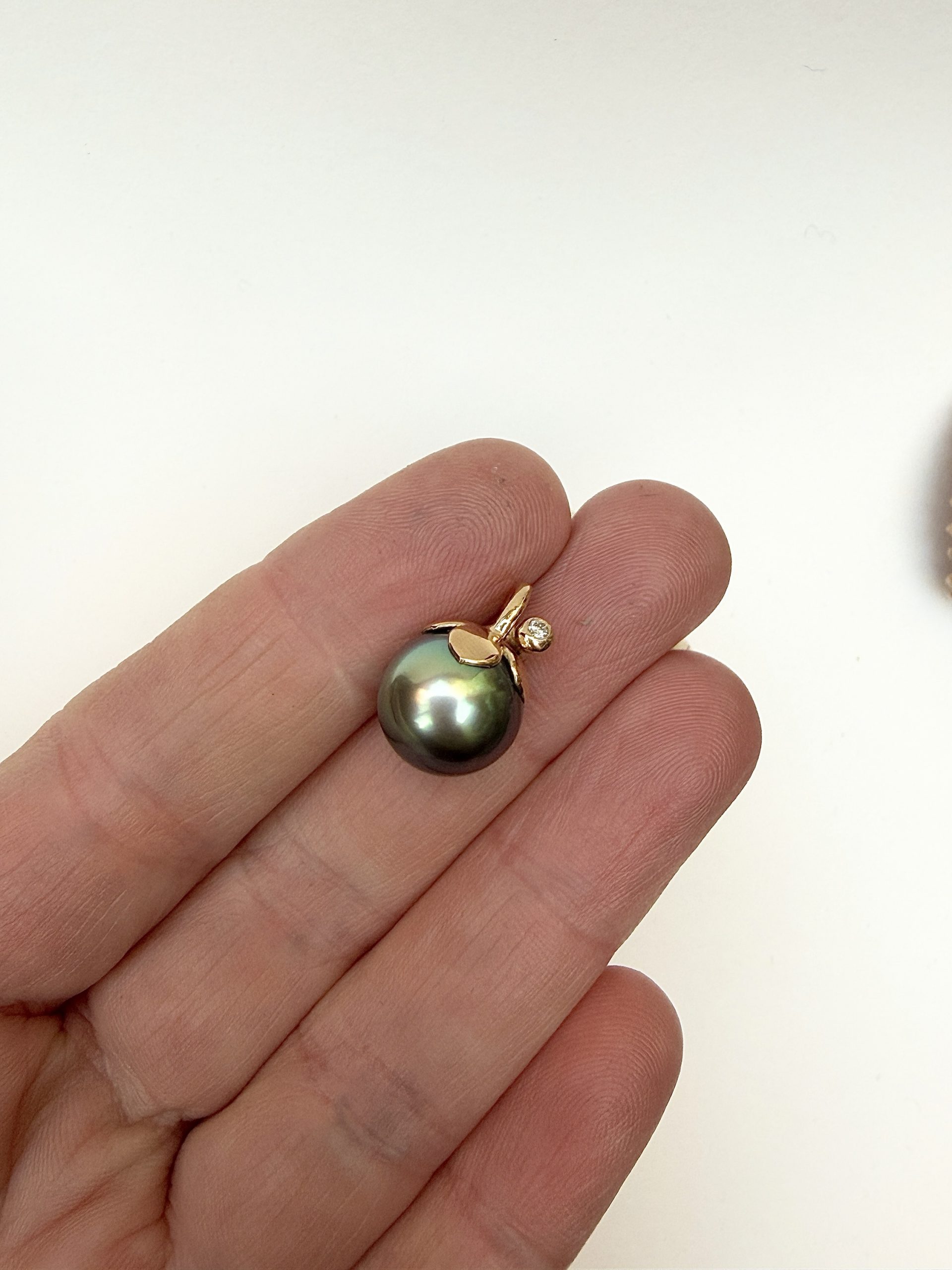 11,5-12 mm round Tahiti pearl and 18 gold with natural white brilliant cut Diamonds, 0,03 carat TWvs