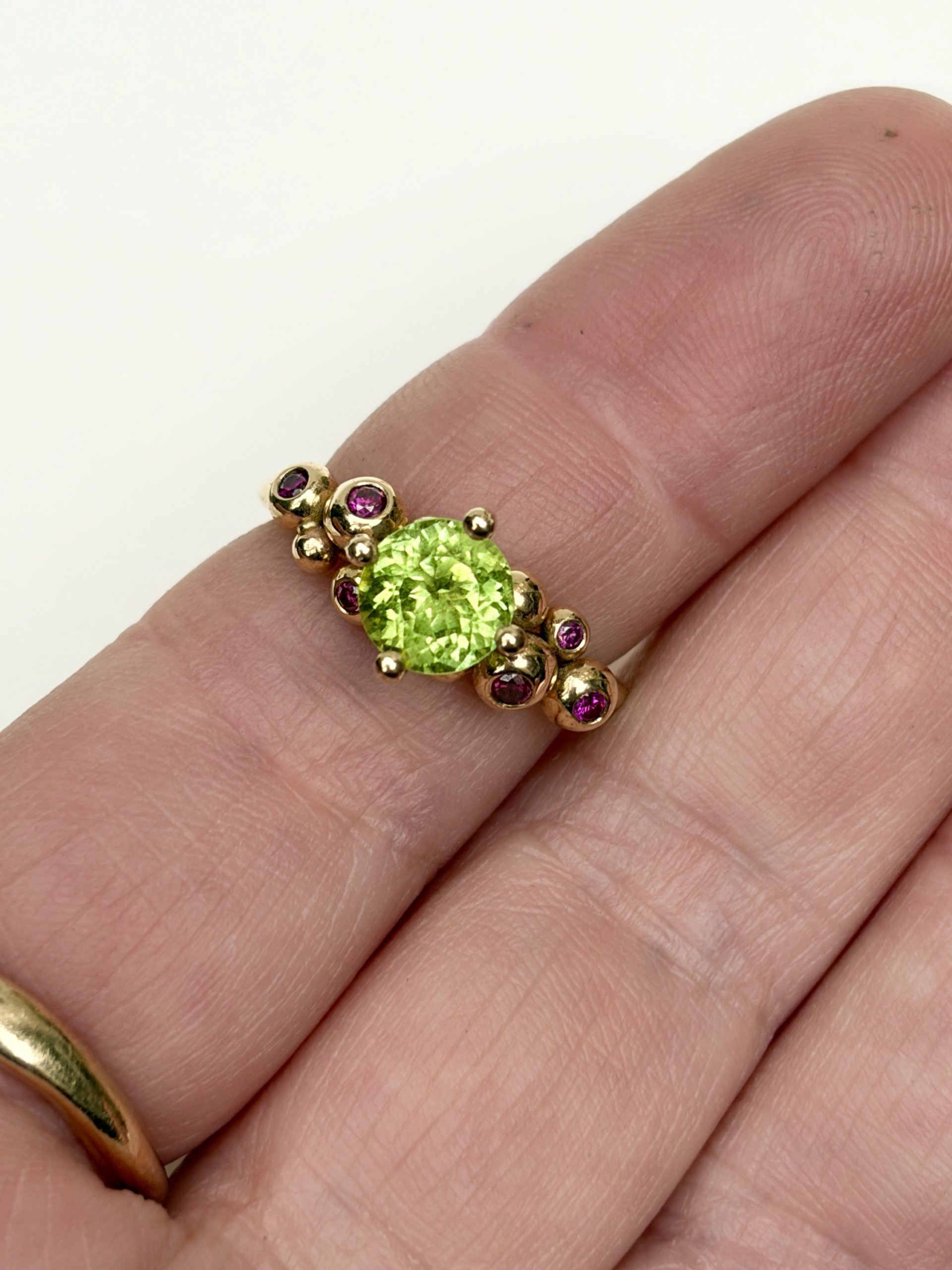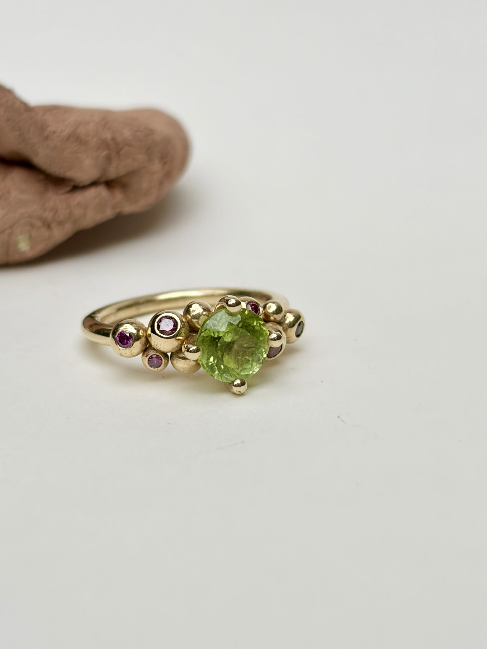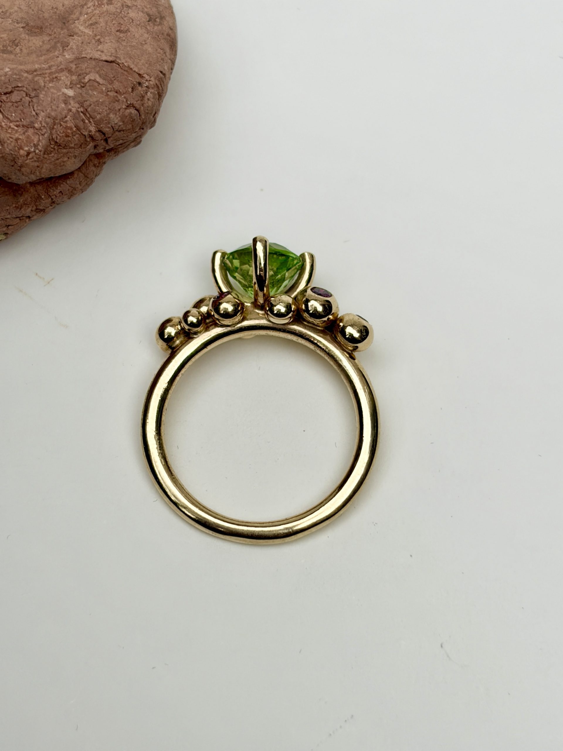 1,6 carat grøn facetsleben turmalin, sat i en 4-grabs fatning. Håndlavet ring i 14 karat guld med lilla diamanter, naturlige HTHP-behandlede.